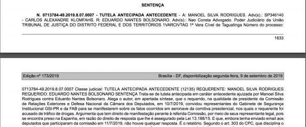 Vinicius Segalla, no DCM - O sargento da Força Aérea Brasileira (FAB) Manoel Silva Rodrigues, que se encontra atualmente preso na Espanha, acusado de transportar 39 quilos de cocaína em avião da comitiva do presidente da República, Jair Bolsonaro, está lutando na Justiça pelo direito de contar a sua versão dos fatos à Comissão de Relações Exteriores da Câmara dos Deputados, presidida por Eduardo Bolsonaro (PSL-SP).