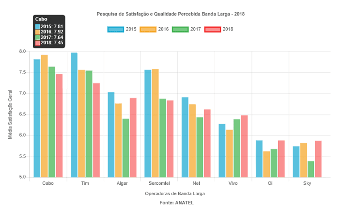 Trazendo números para a análise, podemos ver que no que diz respeito a satisfação do cliente em 2018 os provedores locais se destacaram no top 5. No gráfico abaixo, a pesquisa de satisfação desenvolvida pela Anatel que traz a Cabo Telecom com a melhor nota em relação a todas as demais operadoras brasileiras.