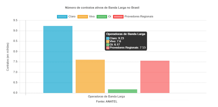 Segundo a Anatel, no último ano foi registrado um total de 30,54 milhões de contratos ativos de banda larga, levando o Brasil a 6ª posição no ranking mundial de assinantes de banda larga fixa. No gráfico abaixo ilustramos o número de contratos por operadora: