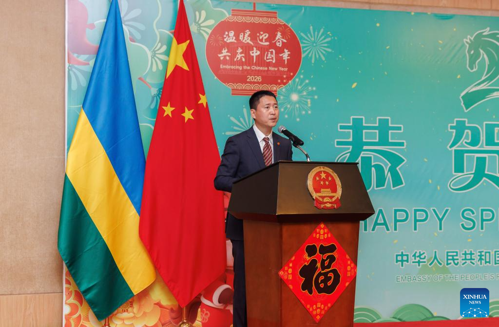 O embaixador chinês em Ruanda, Gao Wenqi, discursa na cerimônia que marcou a chegada da 26ª equipe médica chinesa a Ruanda e a despedida da 25ª equipe em Kigali, Ruanda, em 22 de janeiro de 2026. A cerimônia foi realizada na capital ruandesa na noite de quinta-feira, destacando a cooperação contínua entre Ruanda e China no setor da saúde. (Foto de Cyril Ndegeya/Xinhua)