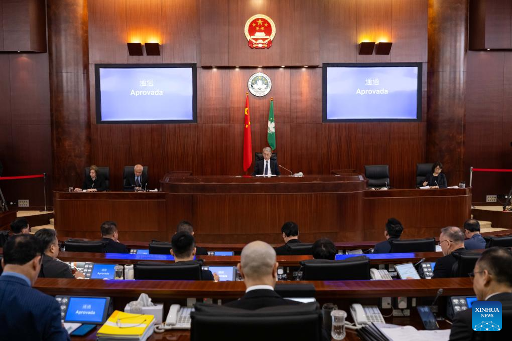 A Assembleia Legislativa da Região Administrativa Especial de Macau (RAEM) realiza uma reunião plenária e aprova a proposta de lei relativa à Comissão de Defesa da Segurança do Estado da RAEM, em Macau, no sul da China, em 19 de março de 2026. (Xinhua/Cheong Kam Ka)