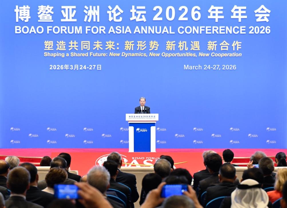Zhao Leji, presidente do Comitê Permanente da Assembleia Popular Nacional, participa de uma sessão plenária da Conferência Anual 2026 do Fórum Boao para a Ásia (BFA, em inglês) e profere um discurso de abertura em Boao, na Província de Hainan, no sul da China, em 26 de março de 2026. (Xinhua/Li Tao)