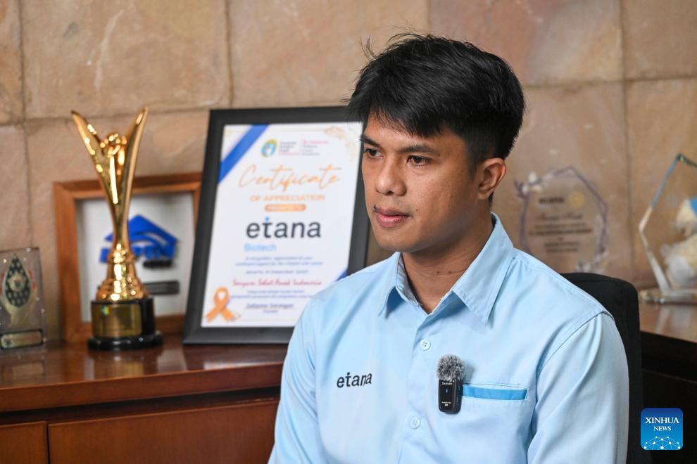 Vino Soaduon, diretor de produção da empresa biofarmacêutica indonésia Etana, é fotografado durante uma entrevista à Xinhua em Jacarta, Indonésia, em 10 de abril de 2026. (Xinhua/Zulkarnain)