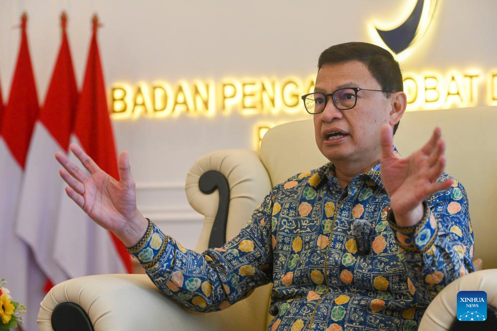 Taruna Ikrar, chefe da Autoridade de Alimentos e Medicamentos da Indonésia (BPOM, na sigla em inglês), fala durante uma entrevista à Xinhua em Jacarta, Indonésia, em 10 de abril de 2026. (Xinhua/Zulkarnain)