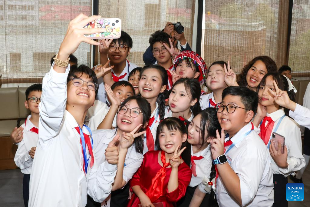 Participantes do programa "Viagens de Estudo Vermelhas" do Vietnã tiram selfie com estudantes chineses no Centro de Ciência e Cultura Soong Ching Ling para Jovens da China, em Beijing, capital da China, em 14 de abril de 2026. Para muitos jovens vietnamitas participantes, as "Viagens de Estudo Vermelhas" pela China foram muito mais do que uma viagem turística, oferecendo, em vez disso, uma jornada através da história revolucionária compartilhada e uma nova inspiração para a geração mais jovem.