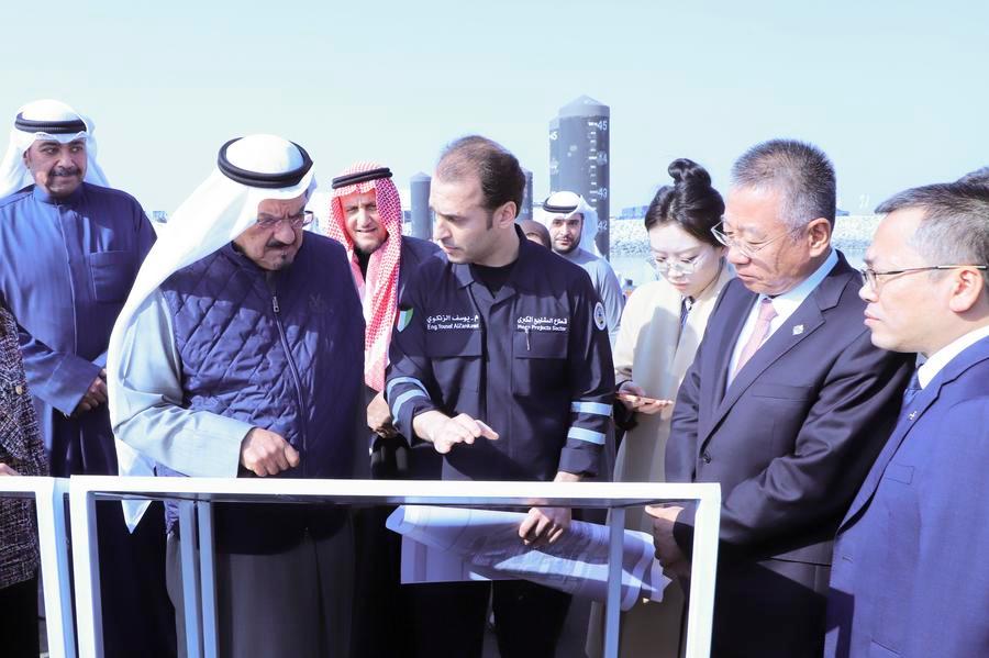 O primeiro-ministro do Kuwait, xeique Ahmad Abdullah Al-Ahmad Al-Sabah (2º à esquerda), visita o local do projeto do Porto Mubarak Al-Kabeer na Ilha Bubiyan, na província de Jahra, Kuwait, em 22 de dezembro de 2025. (Xinhua/Yin Ke)
