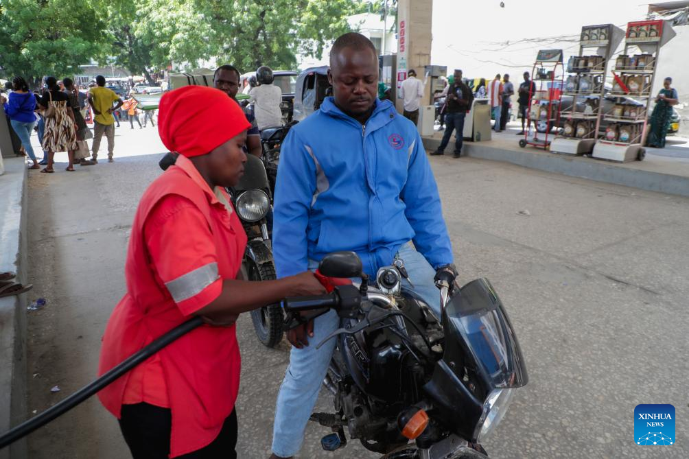 Uma funcionária abastece motocicleta em um posto de gasolina em Dar es Salaam, Tanzânia, em 4 de abril de 2026. (Foto de Emmanuel Herman/Xinhua)