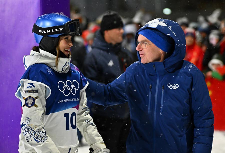 Gu Ailing (esquerda) conversa com Thomas Bach, presidente honorário vitalício do Comitê Olímpico Internacional (COI), após a final do big air feminino do esqui de estilo livre nos Jogos Olímpicos de Inverno Milão-Cortina 2026, em Livigno, Itália, em 16 de fevereiro de 2026. (Xinhua/Zhang Hongxiang)