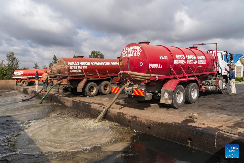 Caminhões despejam esgoto na Estação de Tratamento de Esgoto de Dandora Estate, em Nairóbi, Quênia, em 6 de fevereiro de 2026. (Xinhua/Xie Jianfei)