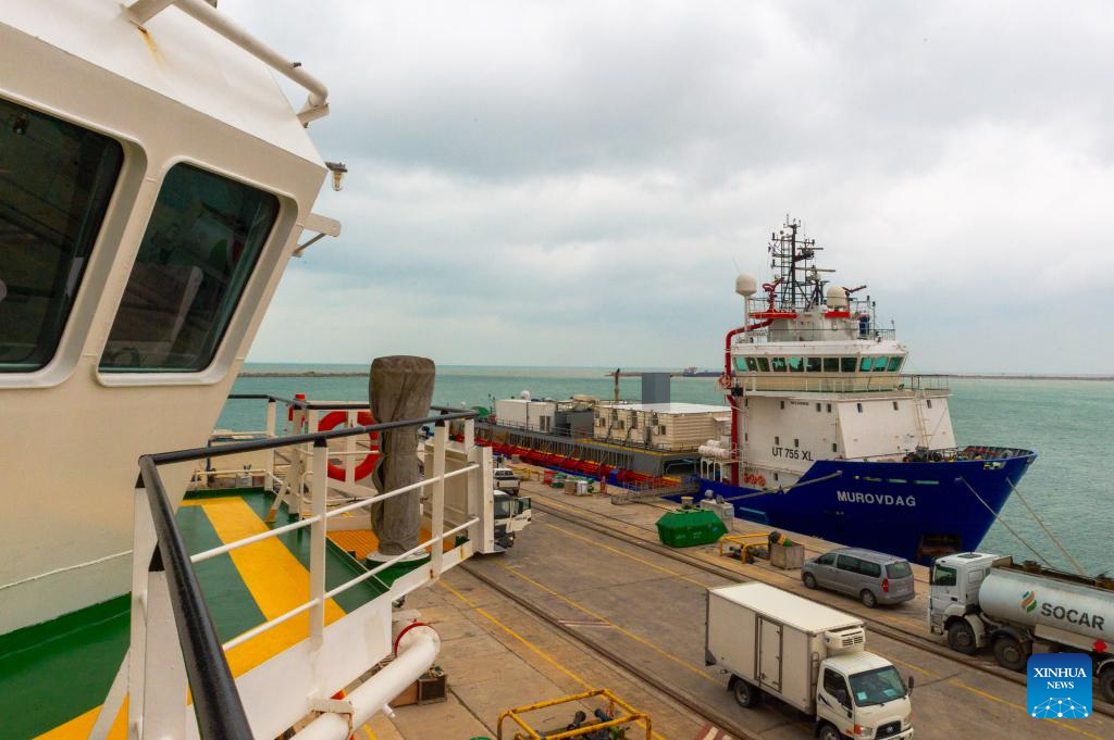 Foto tirada em 10 de fevereiro de 2026 mostra navio de abastecimento no Estaleiro de Baku, em Baku, Azerbaijão. (Xinhua/Chen Junfeng)