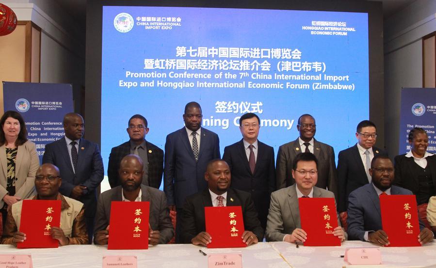 Convidados posam para foto em grupo durante uma conferência de promoção da 7ª edição da Exposição Internacional de Importação da China e do Fórum Econômico Internacional de Hongqiao em Harare, Zimbábue, em 16 de abril de 2024. (Foto de Tafara Mugwara/Xinhua)