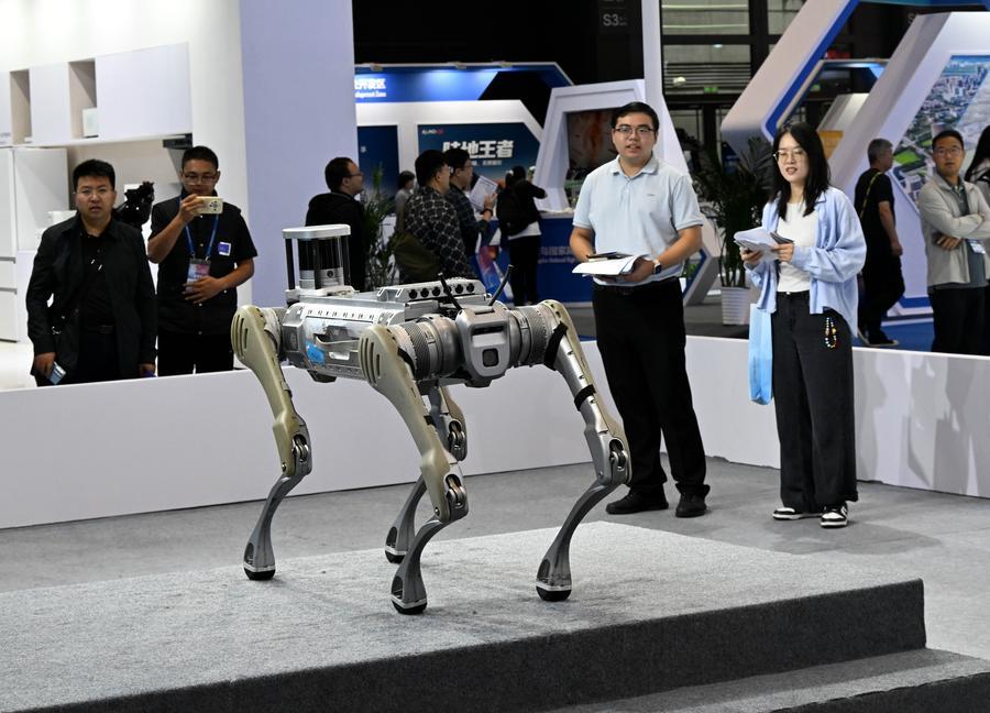 Cão robô é visto na Exposição Internacional de Eletrônicos de Consumo da China (CICE, na sigla em inglês) 2025, em Qingdao, província de Shandong, leste da China, em 19 de setembro de 2025. (Xinhua/Li Ziheng)
