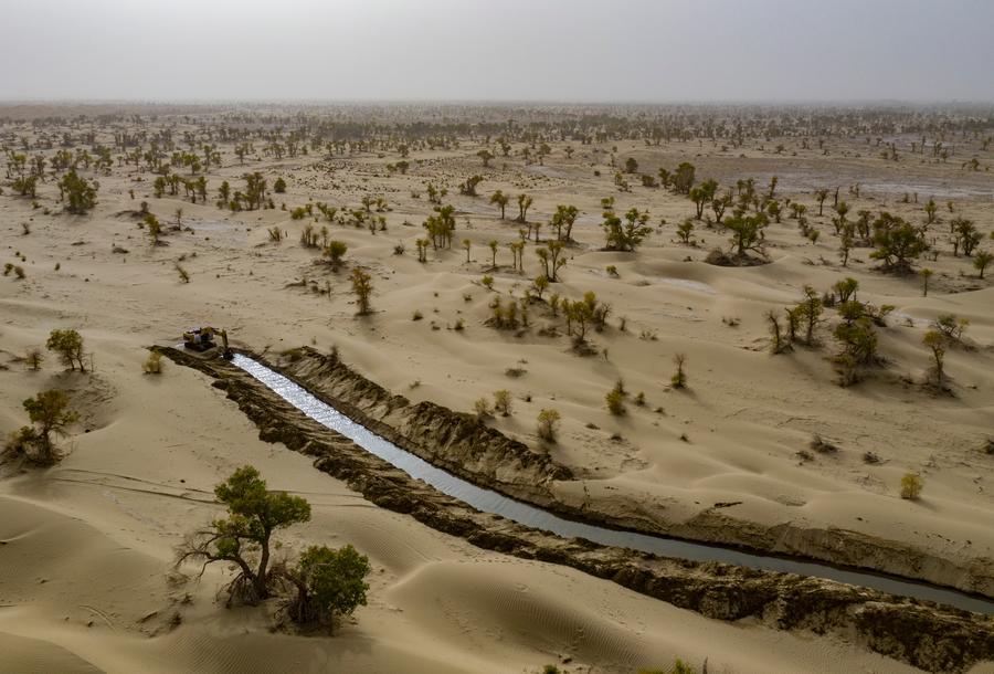 Foto aérea tirada por drone em 19 de setembro de 2025 mostra canal ecológico artificialmente escavado para desvio de enchentes e reabastecimento de água no Deserto de Taklimakan, no Condado de Yuli, Prefeitura Autônoma Mongol de Bayingolin, Região Autônoma Uigur de Xinjiang, noroeste da China. (Xinhua/Chen Shuo)