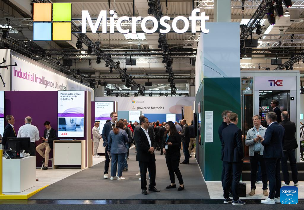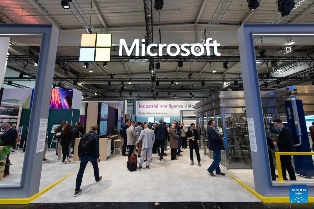 Visitantes na área de exposição da Microsoft na Feira de Hannover 2026, em Hannover, Alemanha, em 20 de abril de 2026.