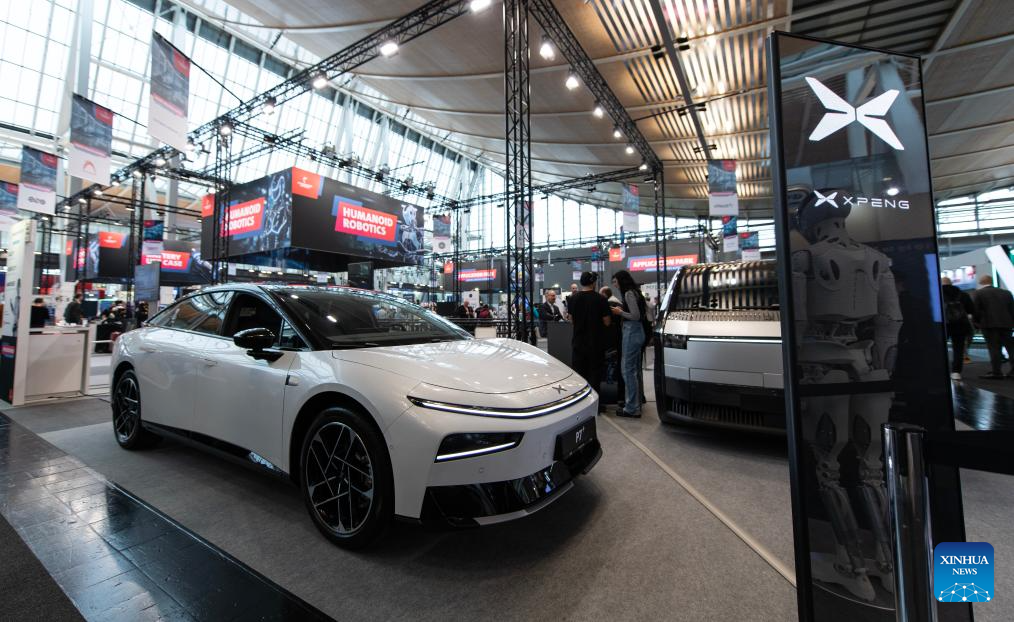 Foto tirada em 20 de abril de 2026 mostra área de exposição da Xpeng na Feira de Hannover 2026, em Hannover, Alemanha.