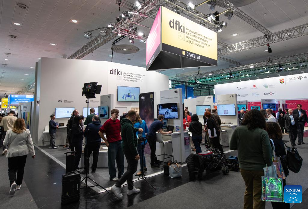 Foto tirada em 20 de abril de 2026 mostra área de exposição do Centro Alemão de Pesquisa em Inteligência Artificial na Feira de Hannover 2026, em Hannover, Alemanha.