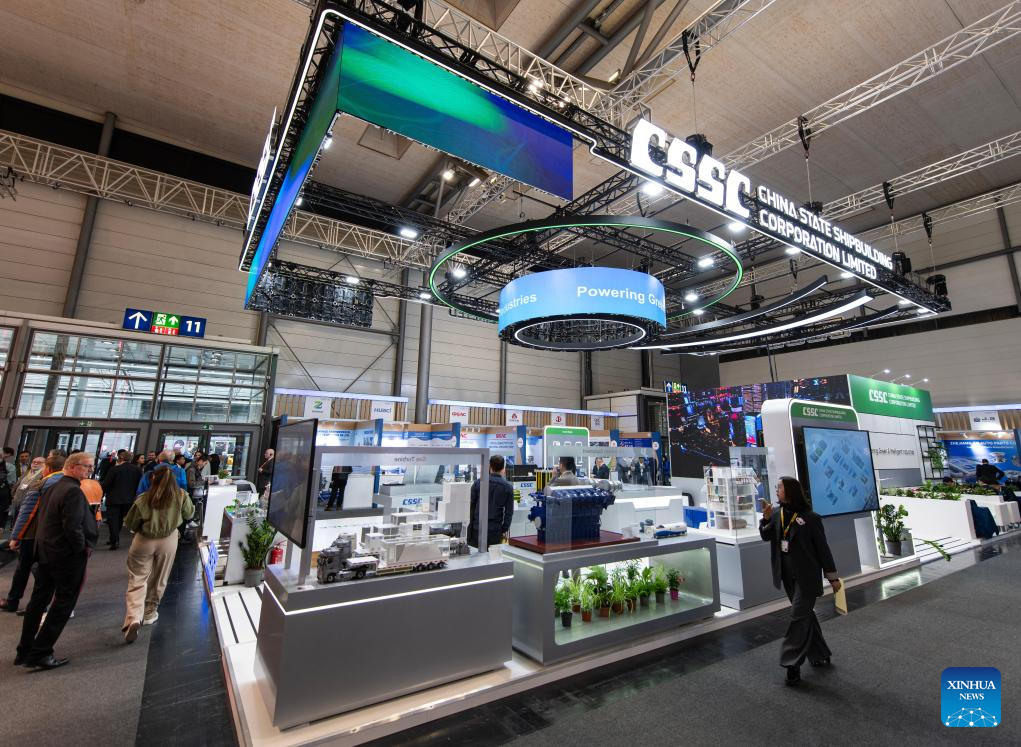 Foto tirada em 20 de abril de 2026 mostra área de exposição da China State Shipbuilding Corporation Limited na Feira de Hannover 2026, em Hannover, Alemanha.