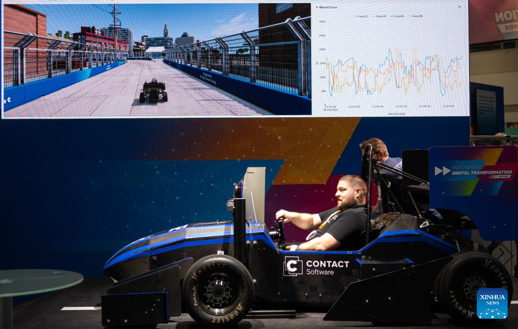 Homem testa simulador de corrida na Feira de Hannover 2026, em Hannover, Alemanha, em 20 de abril de 2026.
