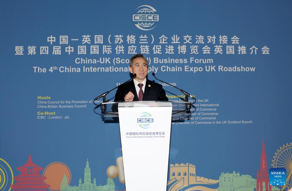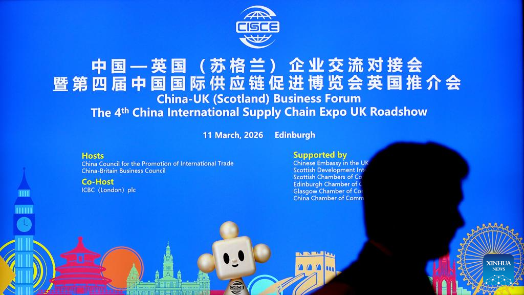 Edimburgo, Reino Unido, 12 mar (Xinhua) -- Um fórum empresarial China-Reino Unido (Escócia) e os eventos do Reino Unido para a 4ª edição da Exposição Internacional da Cadeia de Suprimentos da China (CISCE, na sigla em inglês) foram realizados em Edimburgo na noite de quarta-feira, reunindo mais de 100 representantes do governo, da indústria e da academia para buscar oportunidades de cooperação mais estreita.