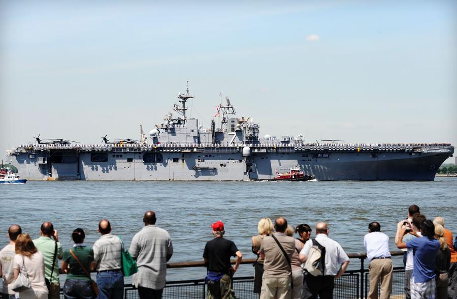 Foto de arquivo mostra visitantes observando o USS Iwo Jima enquanto navegava no Rio Hudson durante o "Desfile de Navios" em Nova York, Estados Unidos, em 25 de maio de 2011. (Xinhua/Shen Hong)