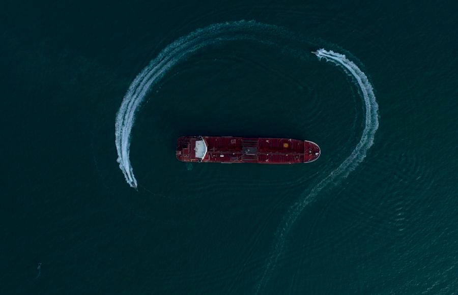 Foto divulgada em 21 de julho de 2019 mostra o petroleiro britânico "Stena Impero" cercado por lanchas rápidas da Guarda Revolucionária Islâmica do Irã (IRGC, na sigla em inglês) no Estreito de Ormuz, Irã. (Morteza Akhoundi/ISNA/Divulgação via Xinhua)