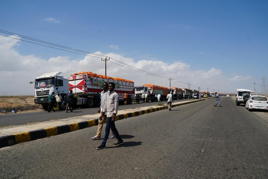 Foto tirada em 8 de março de 2026 mostra caminhões carregados com ajuda humanitária em Porto Sudão, no leste do Sudão. (Foto de Urqia Elzaki/Xinhua)