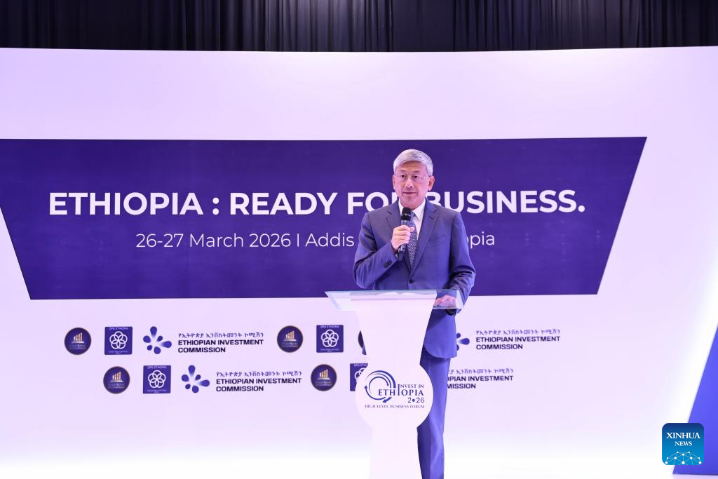 O embaixador chinês na Etiópia, Chen Hai, discursou na sessão de encerramento do Fórum Empresarial de Alto Nível "Invista na Etiópia", em Adis Abeba, Etiópia, em 27 de março de 2026. O principal fórum de investimentos da Etiópia, intitulado "Invista na Etiópia", terminou na sexta-feira com a assinatura de acordos de investimento no valor de mais de 13 bilhões de dólares americanos. A 4ª edição do fórum foi realizada sob o tema "Etiópia: Pronta para Negócios", em Adis Abeba, capital do país, atraindo centenas de investidores, líderes empresariais e consultores do mundo inteiro, segundo os organizadores. (Xinhua/Geng Xinning)