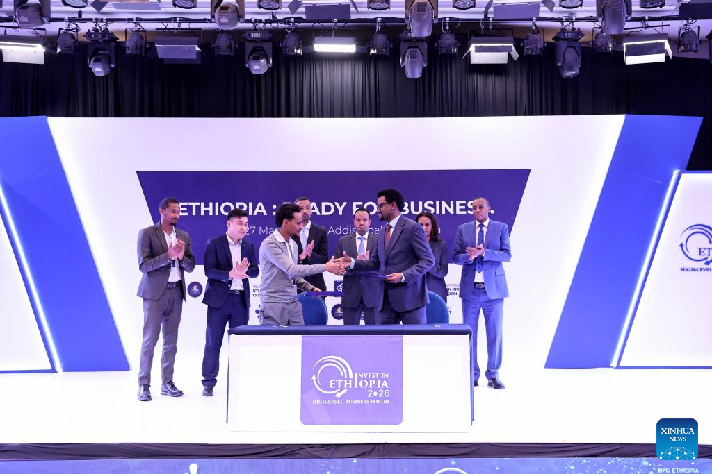 Convidados participam da cerimônia de assinatura de acordos de investimento no Fórum Empresarial de Alto Nível "Invista na Etiópia" em Adis Abeba, Etiópia, em 27 de março de 2026. O principal fórum de investimentos da Etiópia, intitulado "Invista na Etiópia", terminou na sexta-feira com a assinatura de acordos de investimento no valor de mais de 13 bilhões de dólares americanos. A 4ª edição do fórum foi realizada sob o tema "Etiópia: Pronta para Negócios", em Adis Abeba, capital do país, atraindo centenas de investidores, líderes empresariais e consultores do mundo inteiro, segundo os organizadores. (Xinhua/Geng Xinning)