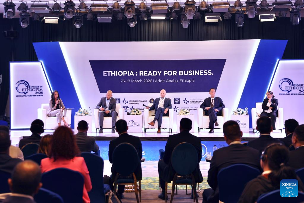 Participantes assistem a um debate no Fórum Empresarial de Alto Nível "Invista na Etiópia", em Adis Abeba, Etiópia, em 27 de março de 2026. O principal fórum de investimentos da Etiópia, intitulado "Invista na Etiópia", terminou na sexta-feira com a assinatura de acordos de investimento no valor de mais de 13 bilhões de dólares americanos. A 4ª edição do fórum foi realizada sob o tema "Etiópia: Pronta para Negócios", em Adis Abeba, capital do país, atraindo centenas de investidores, líderes empresariais e consultores do mundo inteiro, segundo os organizadores. (Xinhua/Geng Xinning)