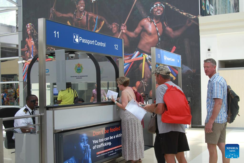 Pessoas passam pelo controle de passaportes no Aeroporto Internacional Robert Gabriel Mugabe em Harare, Zimbábue, em 5 de março de 2026. O fluxo de passageiros do Aeroporto Internacional Robert Gabriel Mugabe, no Zimbábue, registrou crescimento, especialmente após um projeto de expansão financiado pela China, iniciado em 2023, atingindo cerca de 1,65 milhão em 2025, de acordo com a Companhia Aeroportuária do Zimbábue (ACZ, na sigla em inglês). (Foto de Tafara Mugwara/Xinhua)